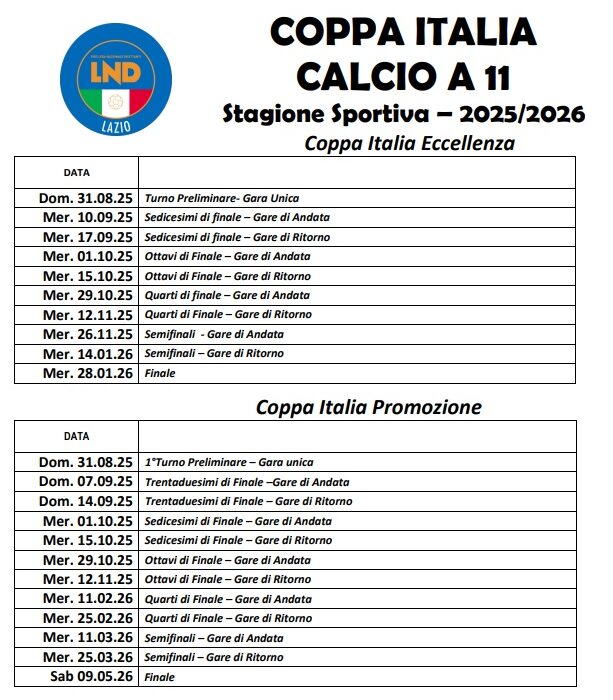 Sempre con il comunicato N° 10 il Comitato Regionale Lazio ha ufficializzato le date della Coppa Italia.