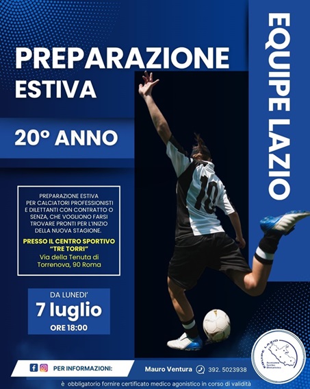 Torna come ormai da 20 anni l’appuntamento con l’Equipe Lazio, la selezione di calciatori disoccupati che si allenano e iniziano la preparazione in vista di trovare squadra. Deus ex machina dell’organizzazione è come sempre il direttore sportivo, nonchè consigliere Adicosp Mauro Ventura che si può contattare tranquillamente al numero 3925023938.